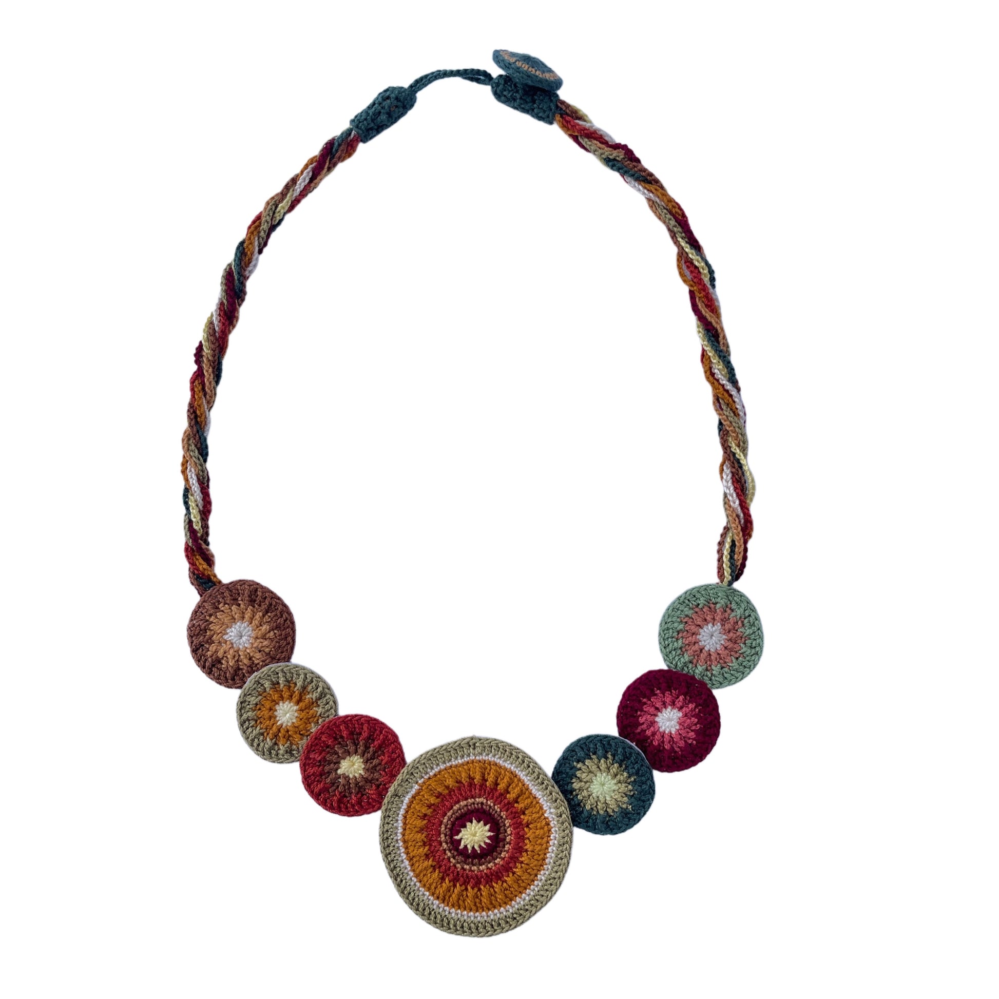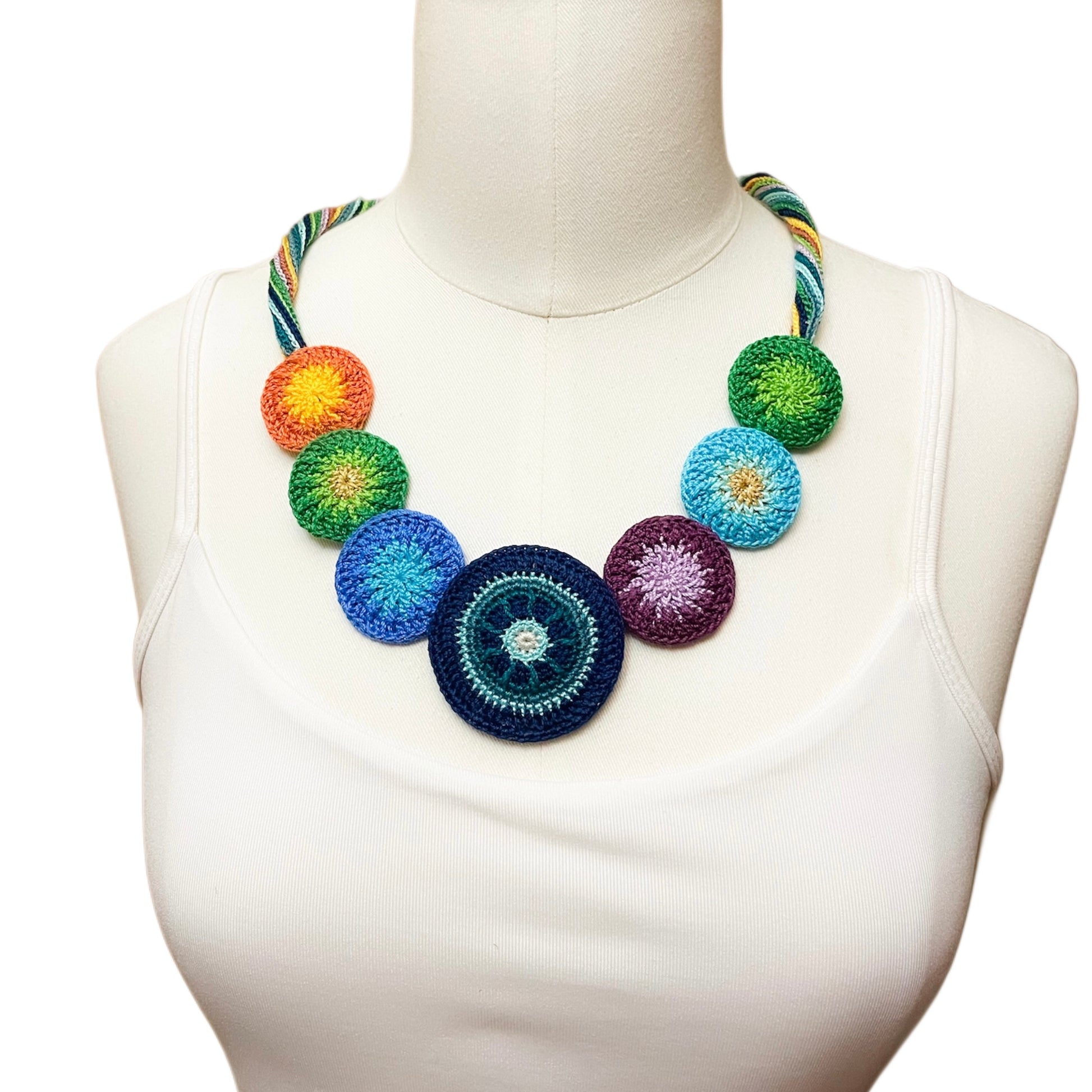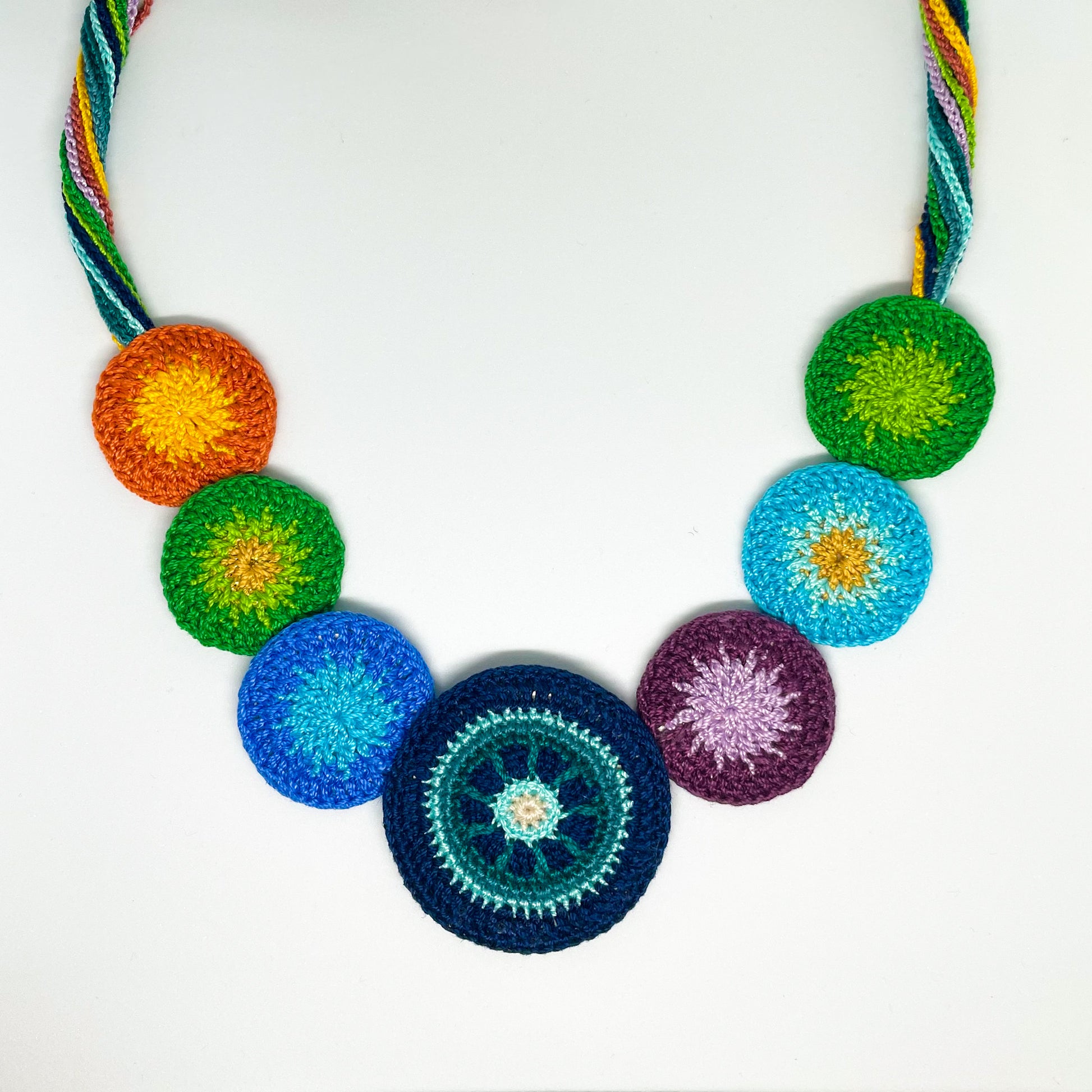 Designed by the founder of crochet by heart, the Hummingbird Necklace is a necklace inspired by the colors of this bird. The mandalas on the necklace reflect the bright colors of the bird and create unique details for the piece.