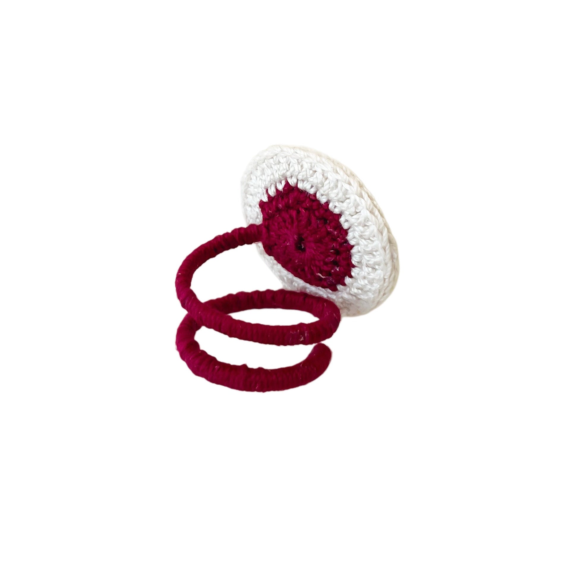 Each piece is made using fine crochet techniques, transforming thread into a distinctive accessory that reflects both artistry and originality. Designed to complement your style, the Spiralis Ring is versatile enough to wear alone or paired with other jewelry from the collection.